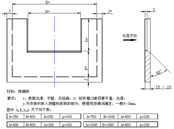 矩形堰可按圖十八加工。水位-流量對(duì)應(yīng)關(guān)系如表二、三、四、五。矩形堰的水位-流量關(guān)系主要取決于堰口寬的“b”。也與上游渠道寬“B”和堰坎高“p”有關(guān)。如使用圖十八的矩形堰,可以在參數(shù)表“液位-流量對(duì)應(yīng)表” ?[1/55]“堰槽種類”內(nèi)選“250矩形堰”、“500矩形堰”等。儀表內(nèi)已有水位流量表。 |