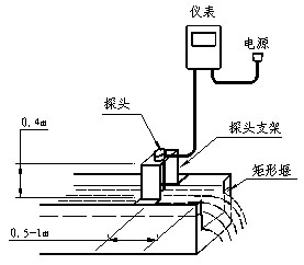 | 矩形堰安裝在渠道上如圖十九。堰板要豎直,要安在渠道的中軸線上。儀表的探頭安裝在距堰板0.5m~1m的位置。 |