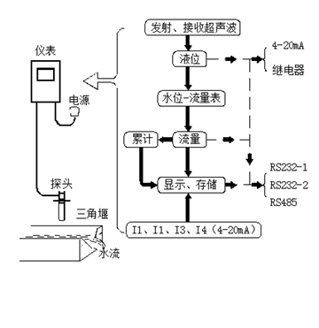 儀表控制探頭發(fā)射和接收超聲波。按圖九的過程轉(zhuǎn)為液位(單位:m)。再查水位-流量表,把液位轉(zhuǎn)成流量(單位可以是:L/s,m3/h,或m3/s)。