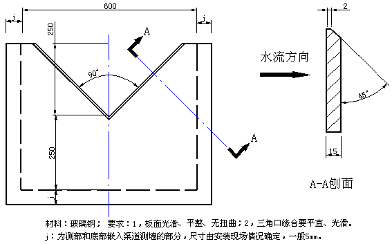 圖十五是一種直角三角堰的加工圖。水位-流量對應關系如表一。注意,安裝該直角三角堰的上游渠道寬是600mm,三角頂角與上游渠底的高度是250mm。如不是這種情況,水位-流量表應另行計算。使用上述三角堰,可以在參數表“3:液位-流量對應表” [1/55]“堰槽種類”內選“直角三角堰”,儀表內已有該堰板的水位-流量表。 |