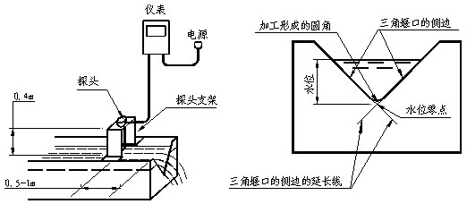 圖十六、三角堰在渠道上的安裝和三角堰的水位零點 |